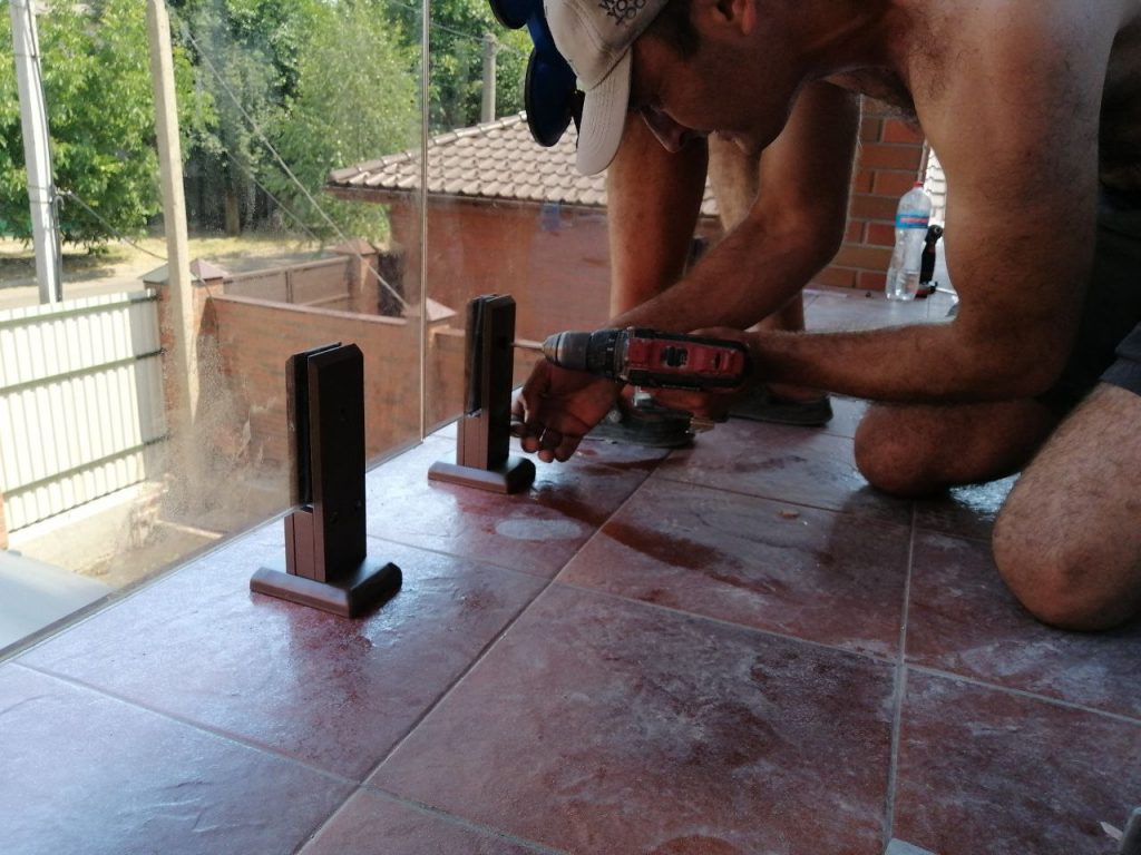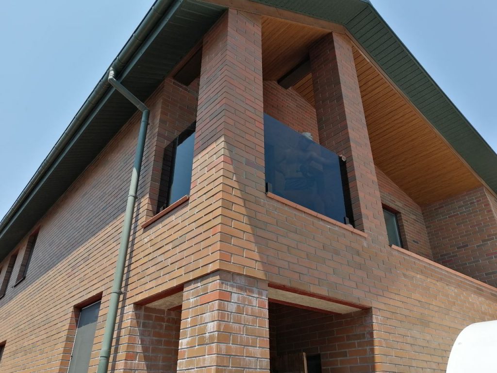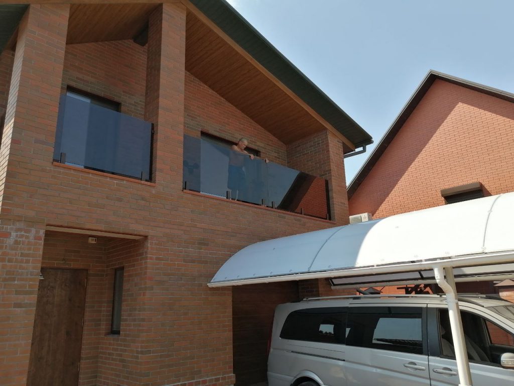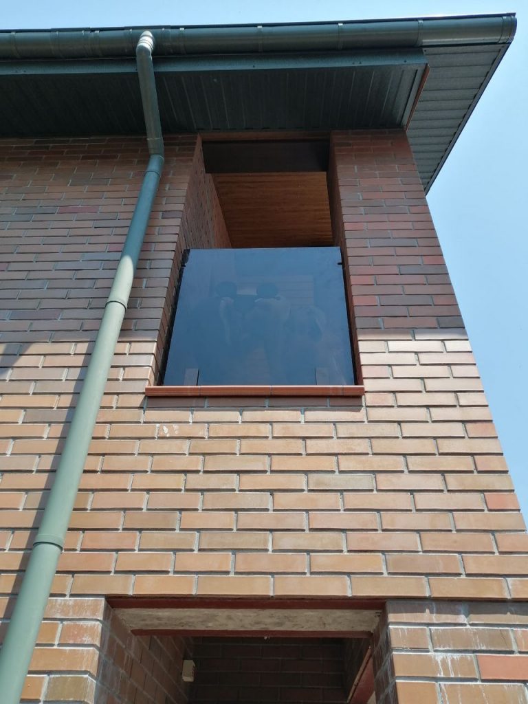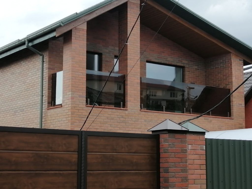 Нами було встановлено скляні перила на балконі приватного будинку. Конструкцію виконано з бронзового триплексу (багатошарового скла) і поверхневих стійок. Такий елемент фасаду кардинально змінює зовнішній вигляд будівлі.